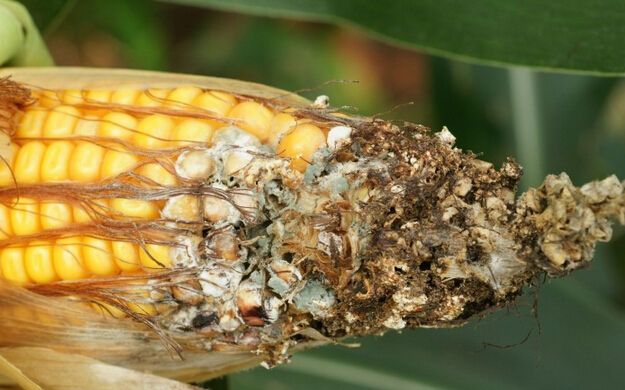 玉米穗腐和粒腐病为多种病原菌侵染引起的病害,主要由禾谷镰刀菌、串珠镰刀菌、青霉菌、曲霉菌、粉红单端孢菌等近20种霉菌(真菌)和细菌侵染引起,其中曲霉菌中的黄曲霉菌不仅为害玉米等多种粮食,还产生对人畜有毒的代谢产物黄曲霉素。因病原菌的不同其发病症状各异,主要表现为果穗及籽粒受害,整个或部分或个别籽粒腐烂,被害果穗顶部或中部变色,真菌性的出现粉红色、蓝绿色、黑灰色或暗褐色、黄褐色霉层等,果穗病部苞叶常被密集的菌丝贯穿,黏结在一起贴于果穗上不易剥离。细菌性穗腐病初期可在外部苞叶上有不规则水浸状病斑,最后为灰黑色霉层,剥开苞叶籽粒腐烂,籽粒为乳白色到褐色湿腐状,穗柄和穗轴病部组织疏松,可见菌脓溢出。